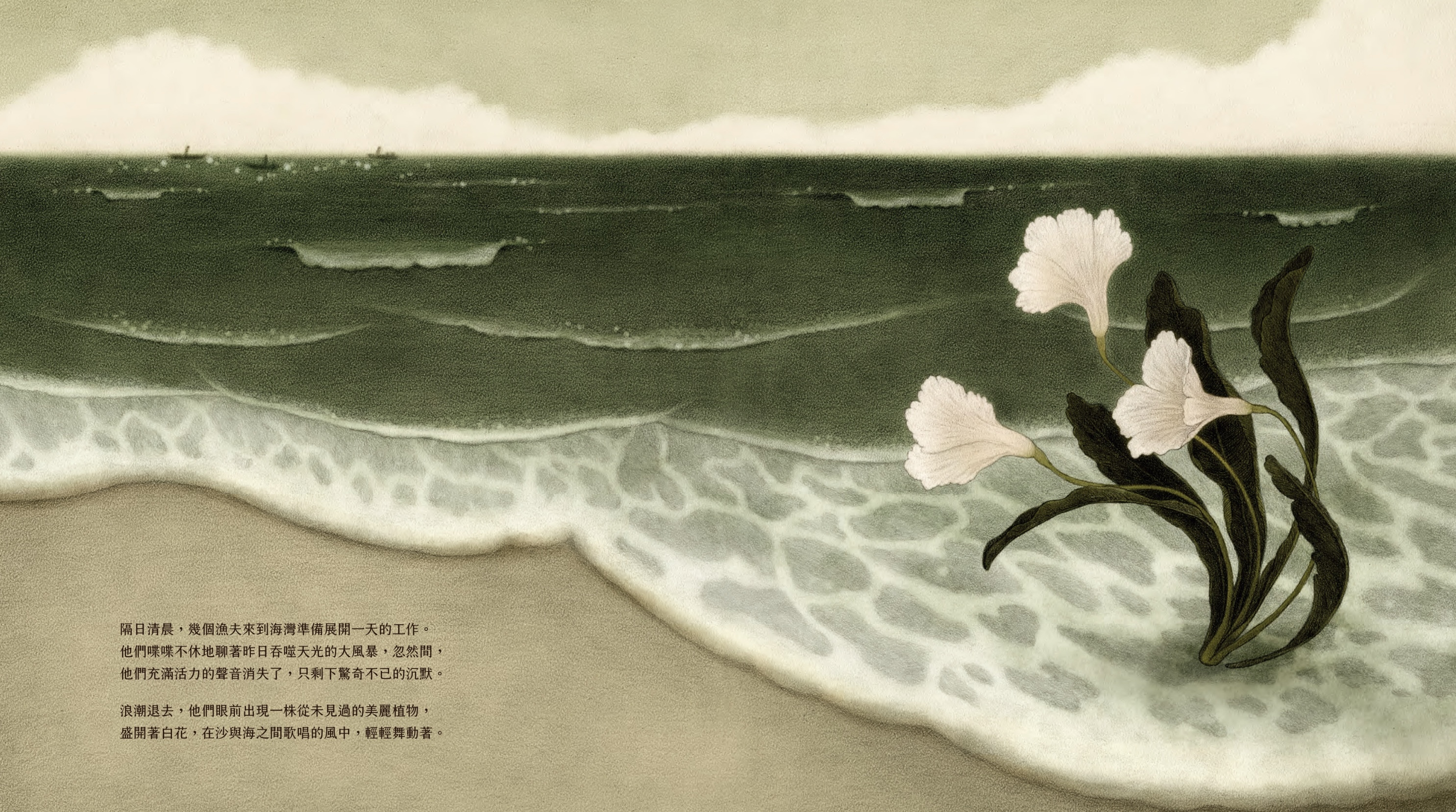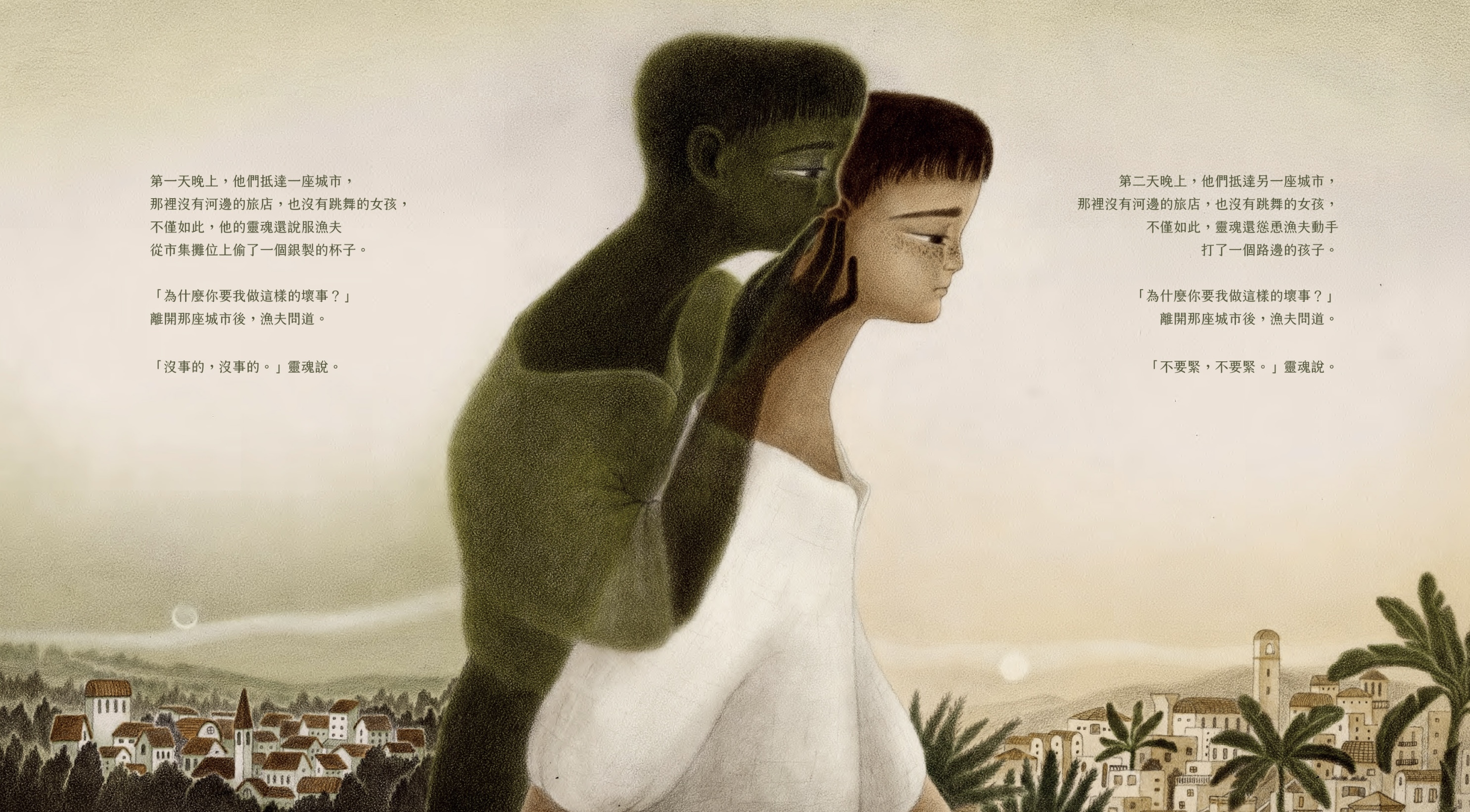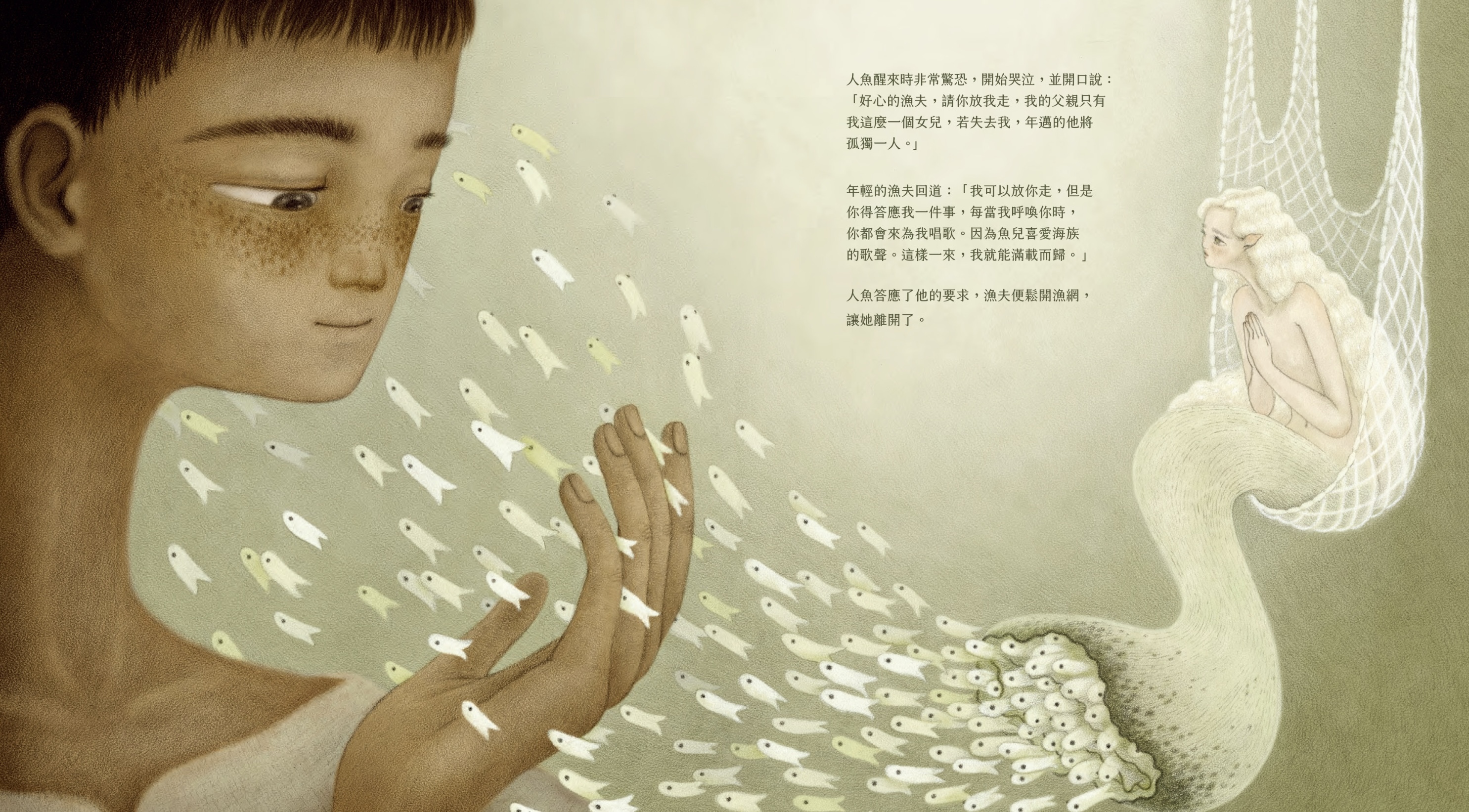 靈魂,在這個故事裡似乎帶著一絲狡詐,它不斷來回拉扯著漁夫的意志;但繪本裡的每一幀畫面卻透過卓霈欣細膩的筆觸,傳遞出角色心境上的變化。這些描繪並不僅僅只有明媚的部分,也包含著游移、躊躇與懊悔。在這部繪本中,圖文並非只是等式般的存在,藉由圖像所開啟的道路,我們能夠窺見王爾德文字裡的多樣面貌,並且能從中感受到各種心緒被承接著的溫柔。