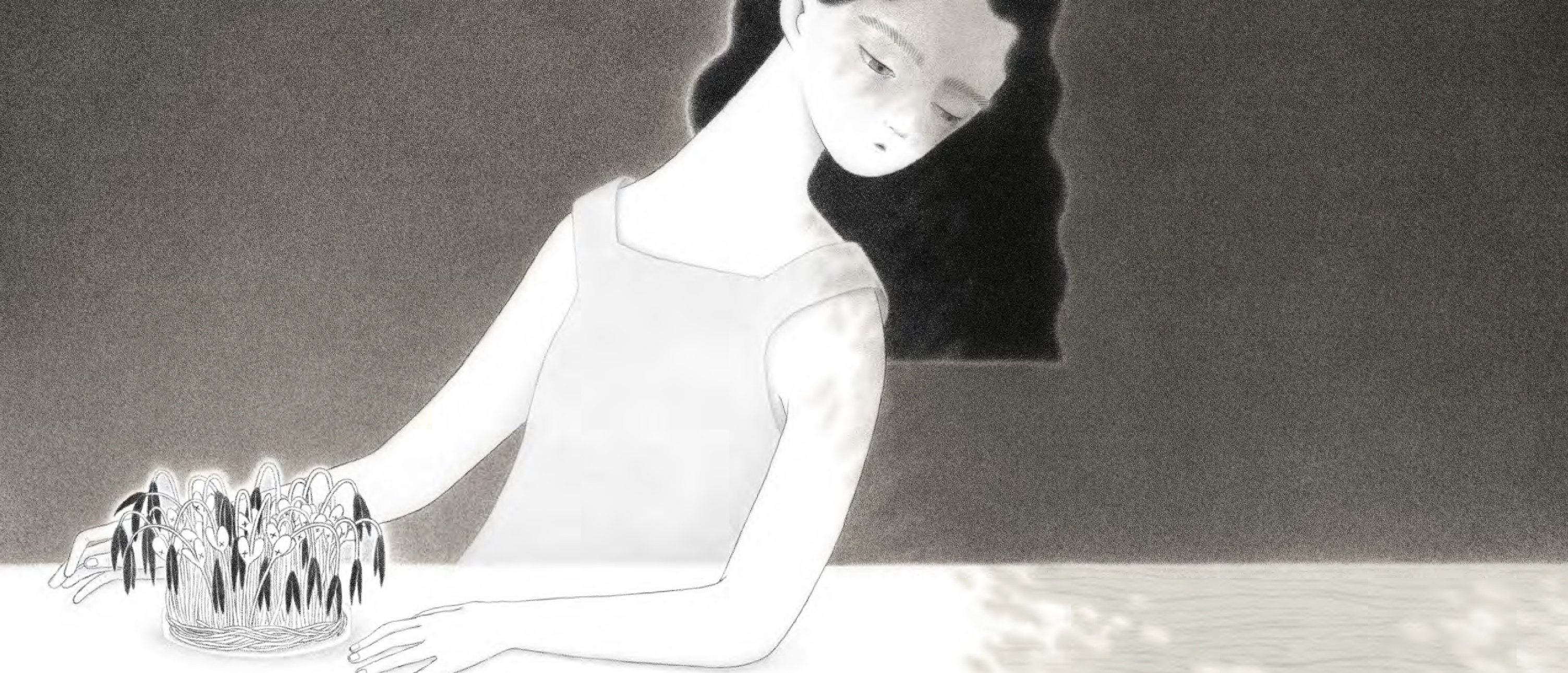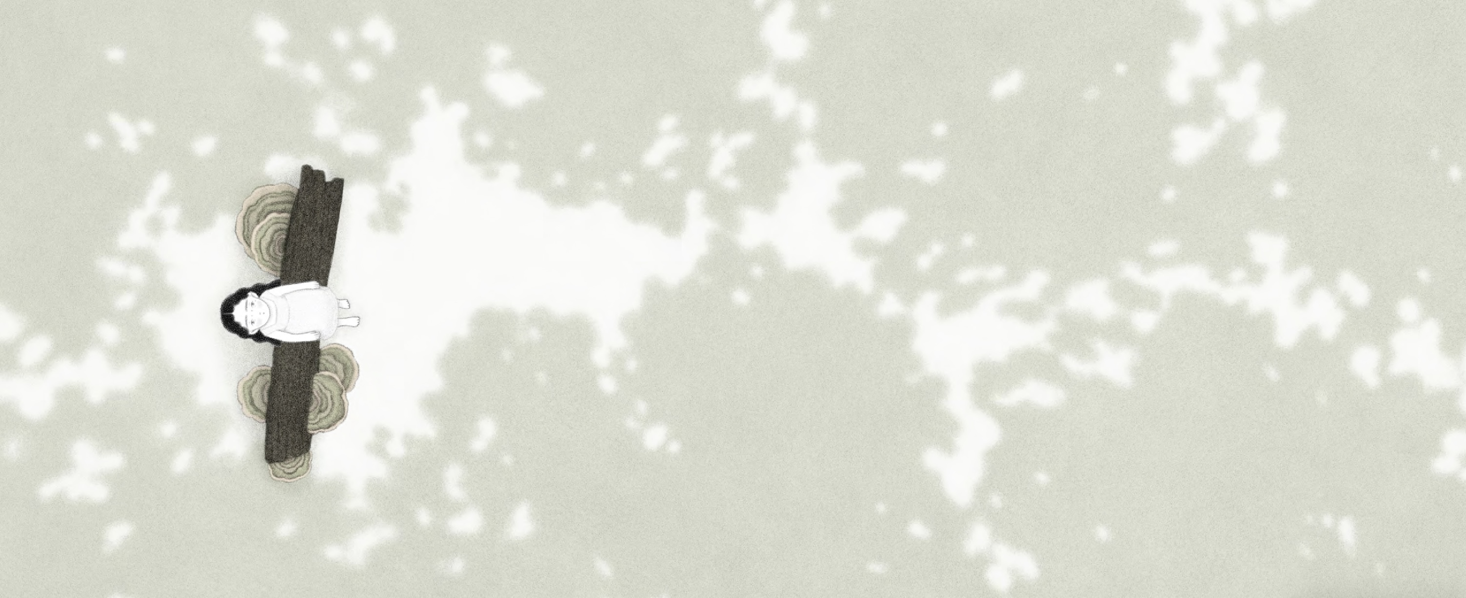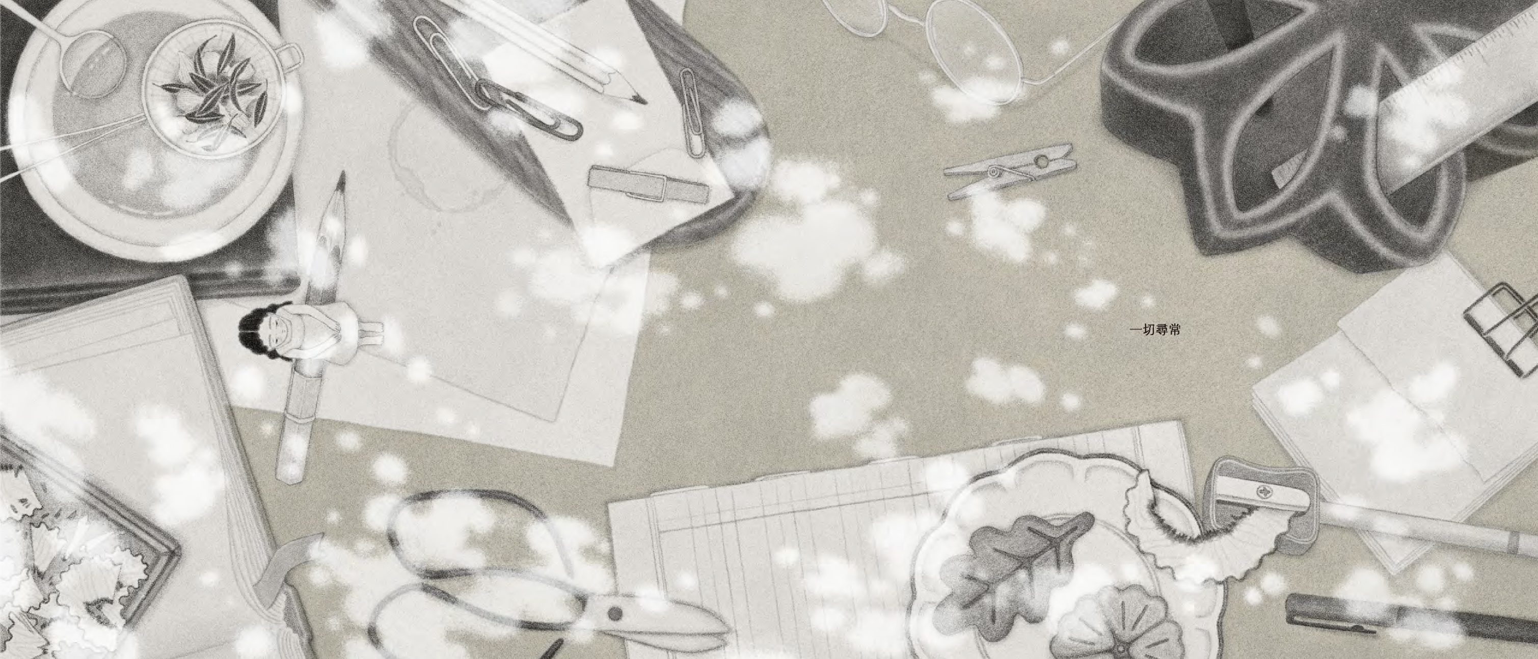 卓霈欣如絲線般細膩的筆觸,刻畫出生物、空間與時間的紋理,輕盈的看不見框架的顆粒,飄散在畫面之中。透過光影與周遭事物的擾動,諸如:樹的成長、飛過的鳥兒與角色身邊更迭的場景,彷彿能夠穿透紙張,看見日子裡流動的痕跡。