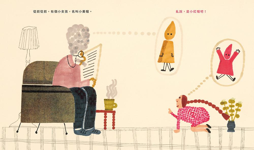 故事從熟悉的經典童話開始。爺爺為孫子講述耳熟能詳的小紅帽,但情節卻錯得離譜:小紅帽一下變成小黃帽,一下又變成小綠帽;要探望的奶奶則變成隔壁阿姨;路上遇到的大野狼更是變成馬和長頸鹿。原本理所當然的發展不再成立,小女孩忍不住一次次糾正:「爺爺,你把故事講錯了。」