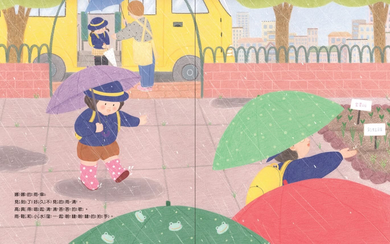 爸爸隨即把目光轉向了娜娜手中的那把雨傘和腳上的那雙雨鞋:「那麼雨傘和雨鞋今天做了什麼呢?」像是咒語般喚醒了故事的魔法,娜娜開始代替身邊的小東西們,說著它們在一整天裡發生的那些事……