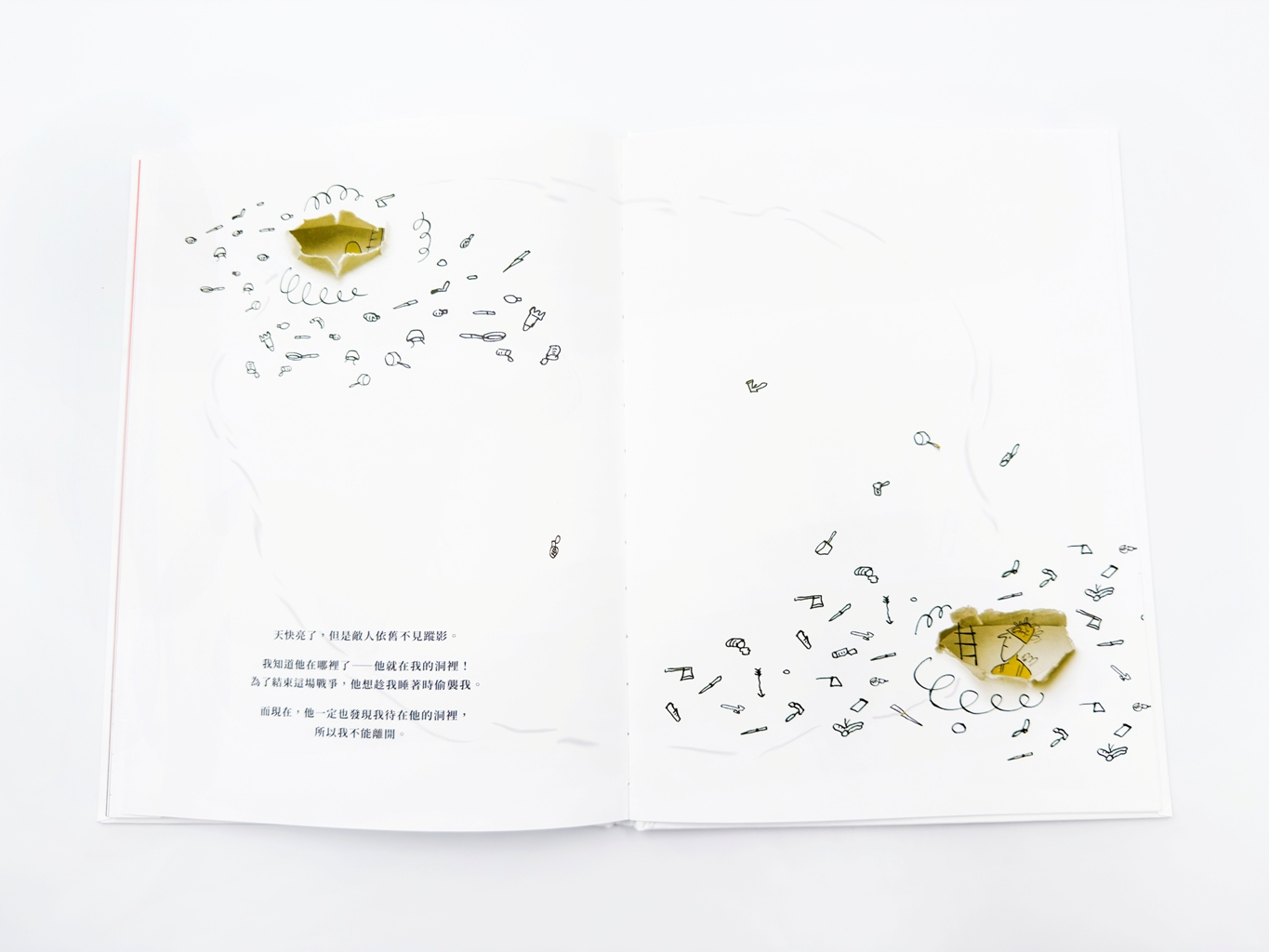 在合作《敵人》時,大衛・卡利與沙基・布勒奇同樣也使用了簡練的黑白塗鴉與特殊書頁設計(比如直接挖了兩個洞在左右頁,製造出雙方在防空洞中對峙的畫面)。