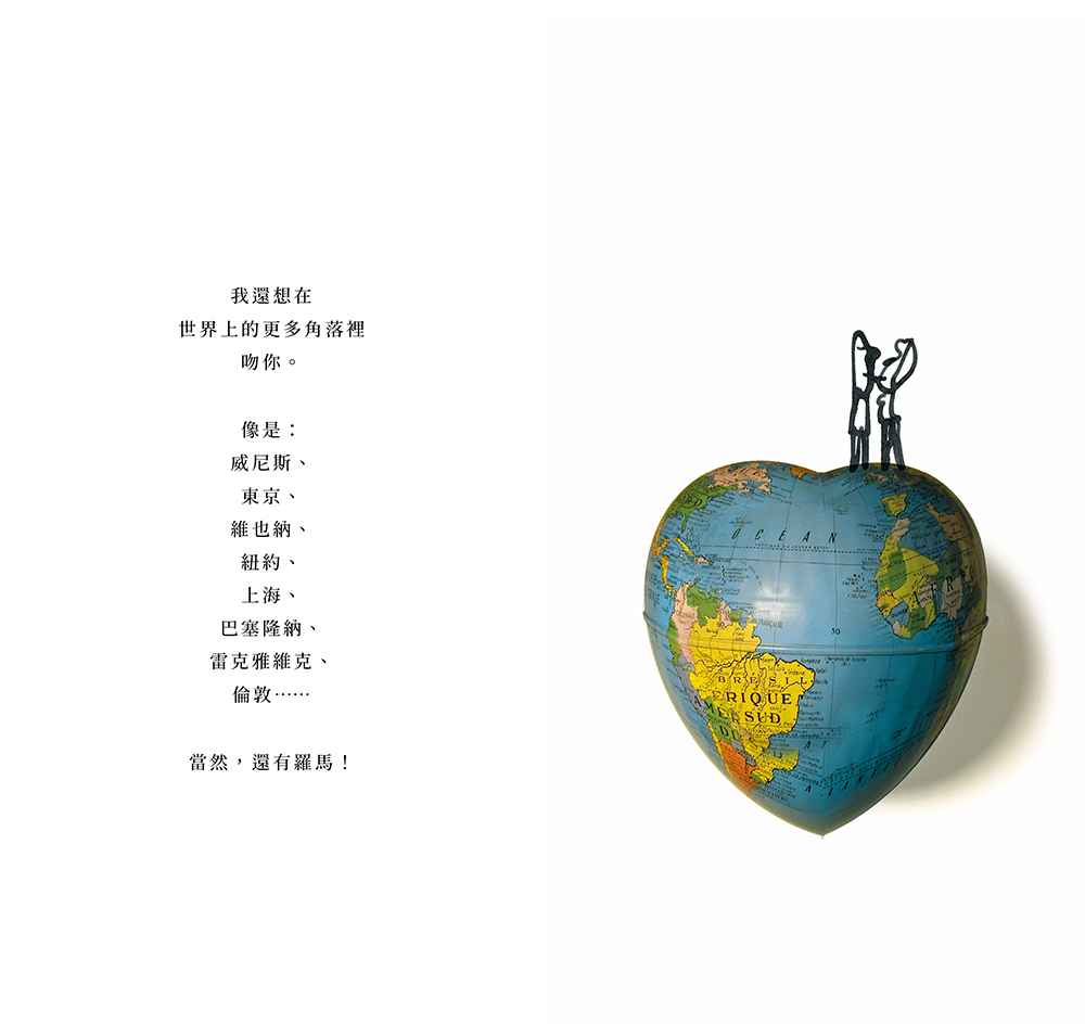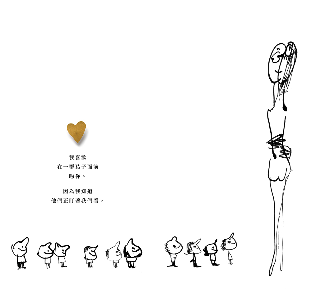 大衛・卡利與沙基・布勒奇攜手合作的第三本《吻你》,更是將這種簡約的創作形式發揮得淋漓盡致,黑色墨筆所繪的塗鴉線條潦草,甚至有些稚氣、笨拙,搭配日常中唾手可得的物件,譜出一頁頁戀人絮語。