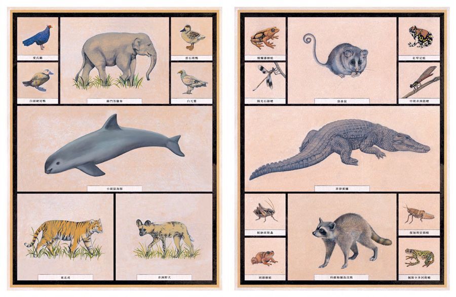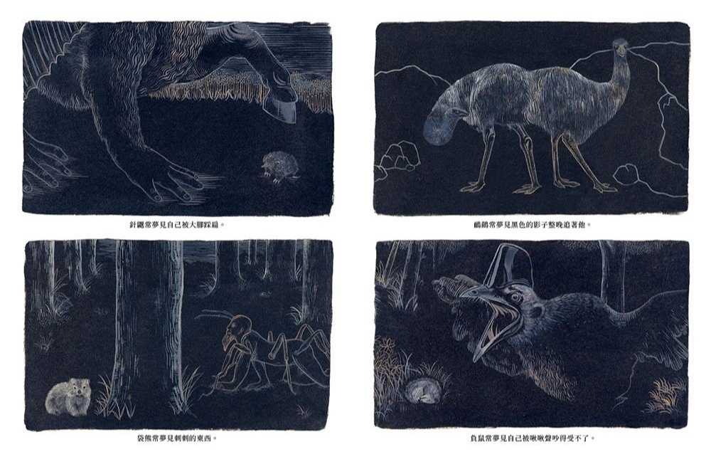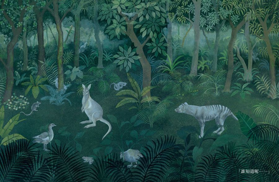 閱讀至此,敏銳的讀者肯定大夢初醒,想起剛翻開本書扉頁時,那圖鑑般的60種生物,正是住在影之島上的絕種生物:袋狼、棕褐紅光蛇、大海雀、渡渡鳥⋯⋯。而書末還有68隻夢境越來越稀薄的瀕危動物,隨時將要啟程前往影之島。