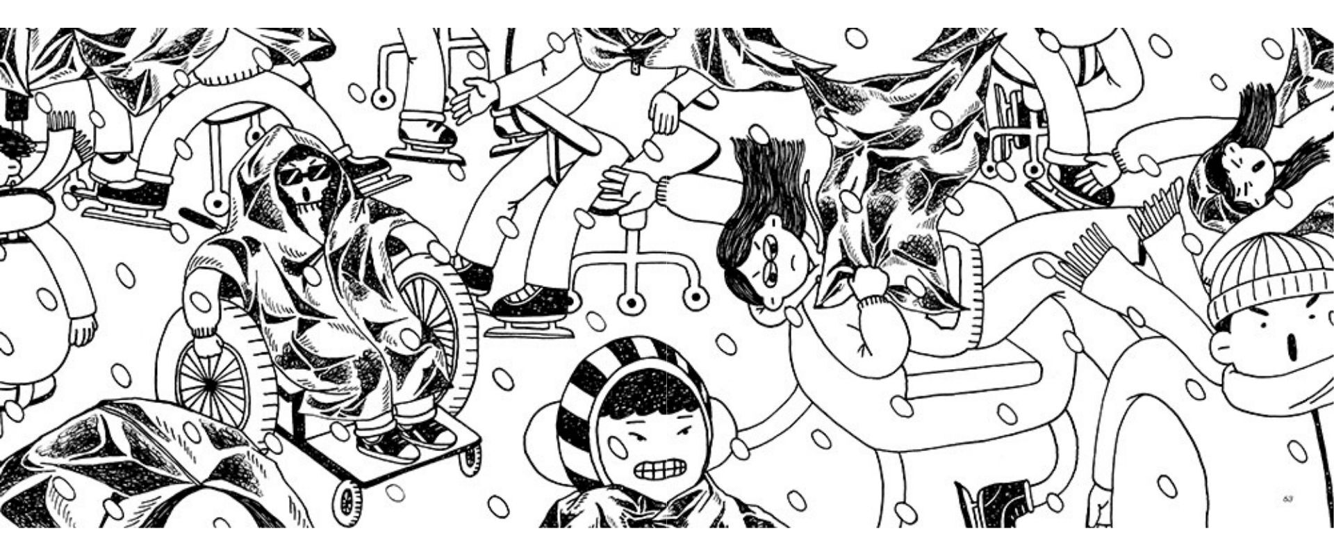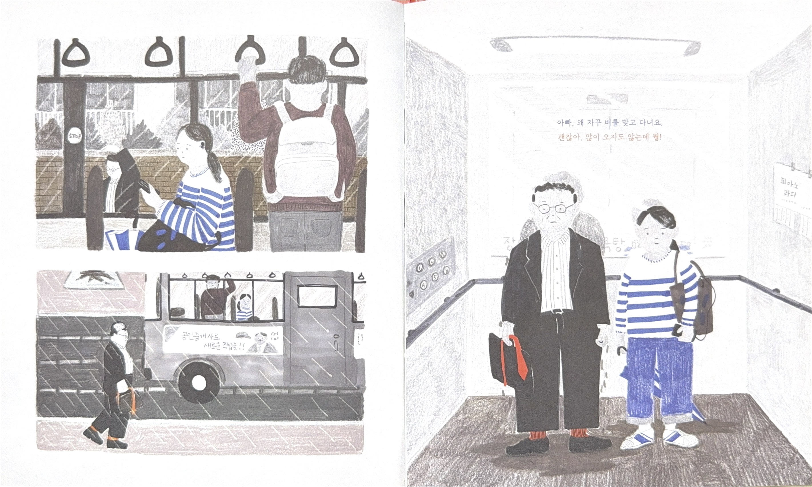 在溫暖且細緻的色鉛筆筆觸下,尹汝俊描繪了爺爺規律而充實的冬日日常。乍看下獨自一人的生活起居,其實仍有其他成員默默地陪伴著爺爺——陽台上的花草盆栽、魚缸裡的魚群。同時,他依舊維持著自己的步調緩緩前行:每日準時出門運動,回家的路上再順手帶回一束鮮花。