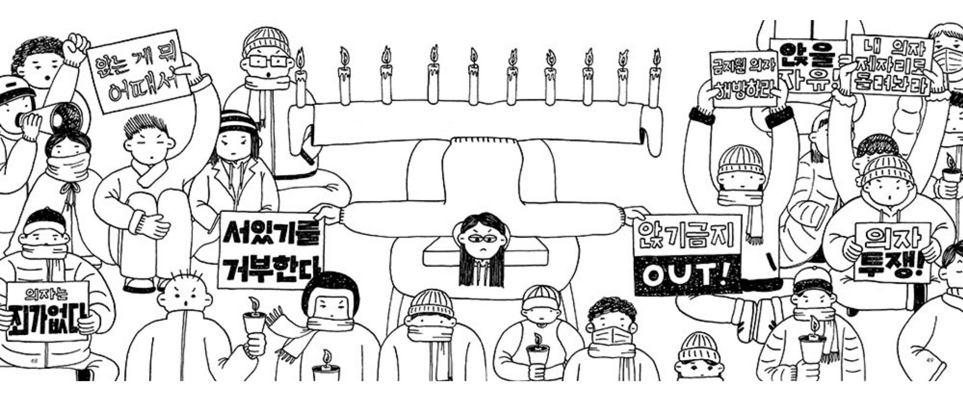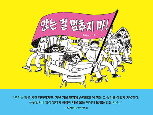圖像小說《앉는 걸 멈추지 마!》(暫譯:不要停止坐下!)這本作品便這樣誕生於JUJUBE BOOKS。尹汝俊分享到,在與作者둘채(Dulchae)進行出版討論時,她特別建議加入韓國示威遊行中獨有的畫面——在寒冷的冬夜街頭,人們披著保暖毯的身影,就像是Hershey's Kisses(好時之吻)水滴型巧克力的模樣。尹汝俊認為,這個畫面的存在,能讓讀者更加身歷其境。